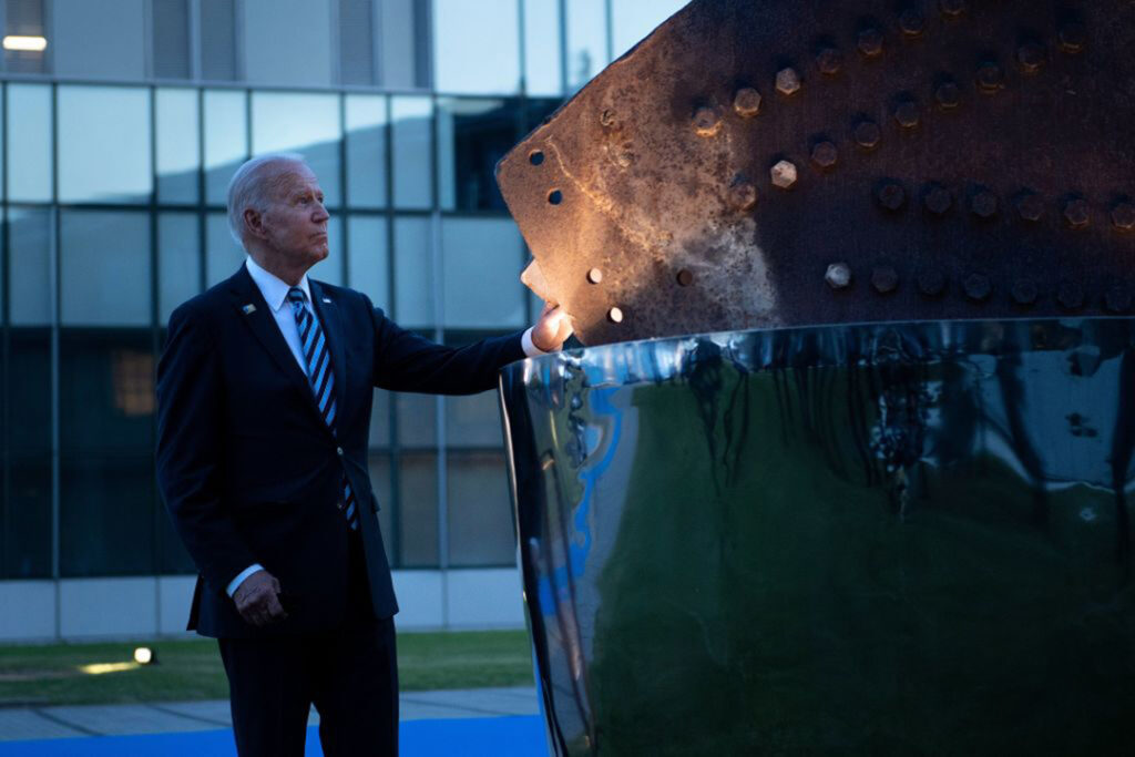 バイデン大統領は、2001年9月11日に過激派テロ集団「アルカイダ」による攻撃で倒壊した米国のワールドトレードセンターの破片が追悼として展示されている北大西洋条約機構本部を訪れた。