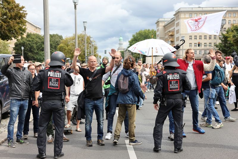ドイツの一部地域でワクチン未接種者に対する規制強化が検討されており、デモ参加者らは「われわれの子どもたちに触るな」と連呼し、「ワクチンアパルトヘイト(人種隔離政策)」と書かれたプラカードを掲げた。