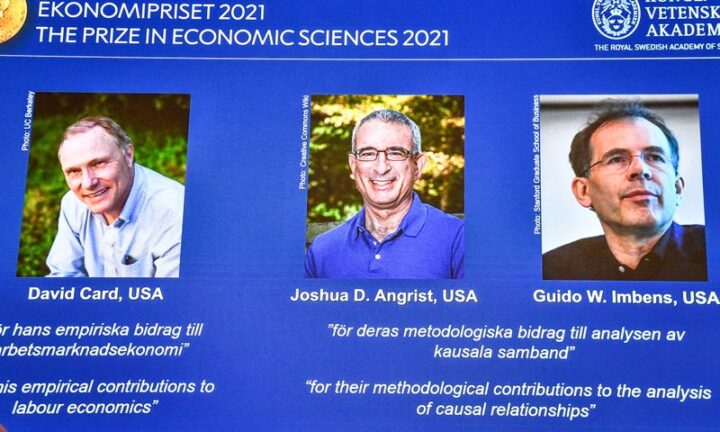 [ストックホルム 11日 ロイター] – スウェーデン王立科学アカデミーは11日、2021年のノーベル経済学賞を米カリフォルニア大バークレー校のデービッド・カード氏(65)、米マサチューセッツ工科大(MIT)のヨシュア・アングリスト氏(61)、米スタンフォード大のグイド・インベンス氏(58)に授与すると発表した。最低賃金引き上げなどの経済的影響を「自然実験」により確かめたことが評価された。