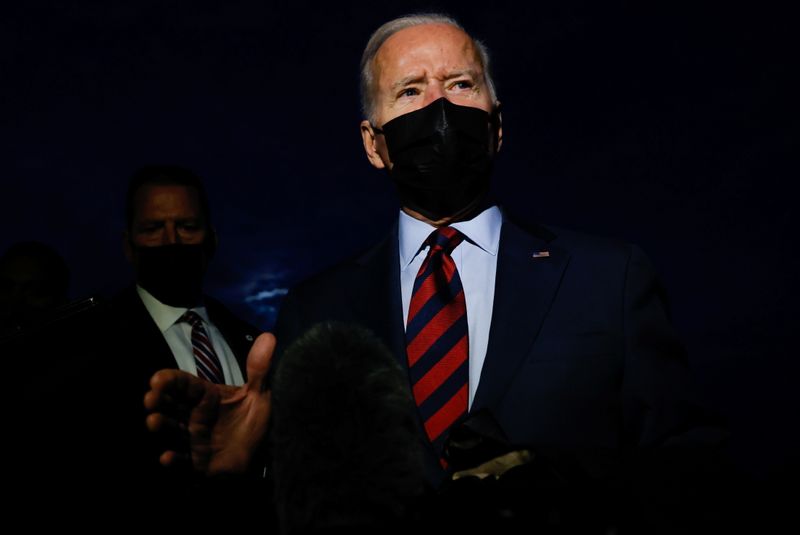 11月16日、バイデン米大統領は記者団に対して、台湾に関する政策を変更するつもりは全くないとし、米国は台湾に独立を促していないと述べた。米ニューハンプシャー州の空港で撮影(2021年 ロイター/Jonathan Ernst)
