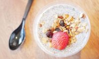 材料は、植物性プロテインパウダー大さじ1、冷凍イチゴ1⁄3カップ、冷凍バナナ1⁄4本、アーモンドミルクまたはココナッツミルク1⁄2カップ、アーモンドペースト大さじ1⁄2。