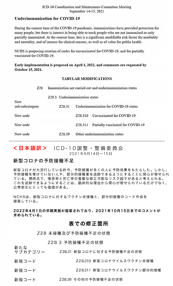 以下は、会議中に配布されたアジェンダ(4)の194ページのスクリーンショットだ。NCHSは、 「予防接種を受けていない人や部分的接種者の追跡に、関心が寄せられている」 としており、新たなICD-10コードを追加することで、追跡方法を編み出した。