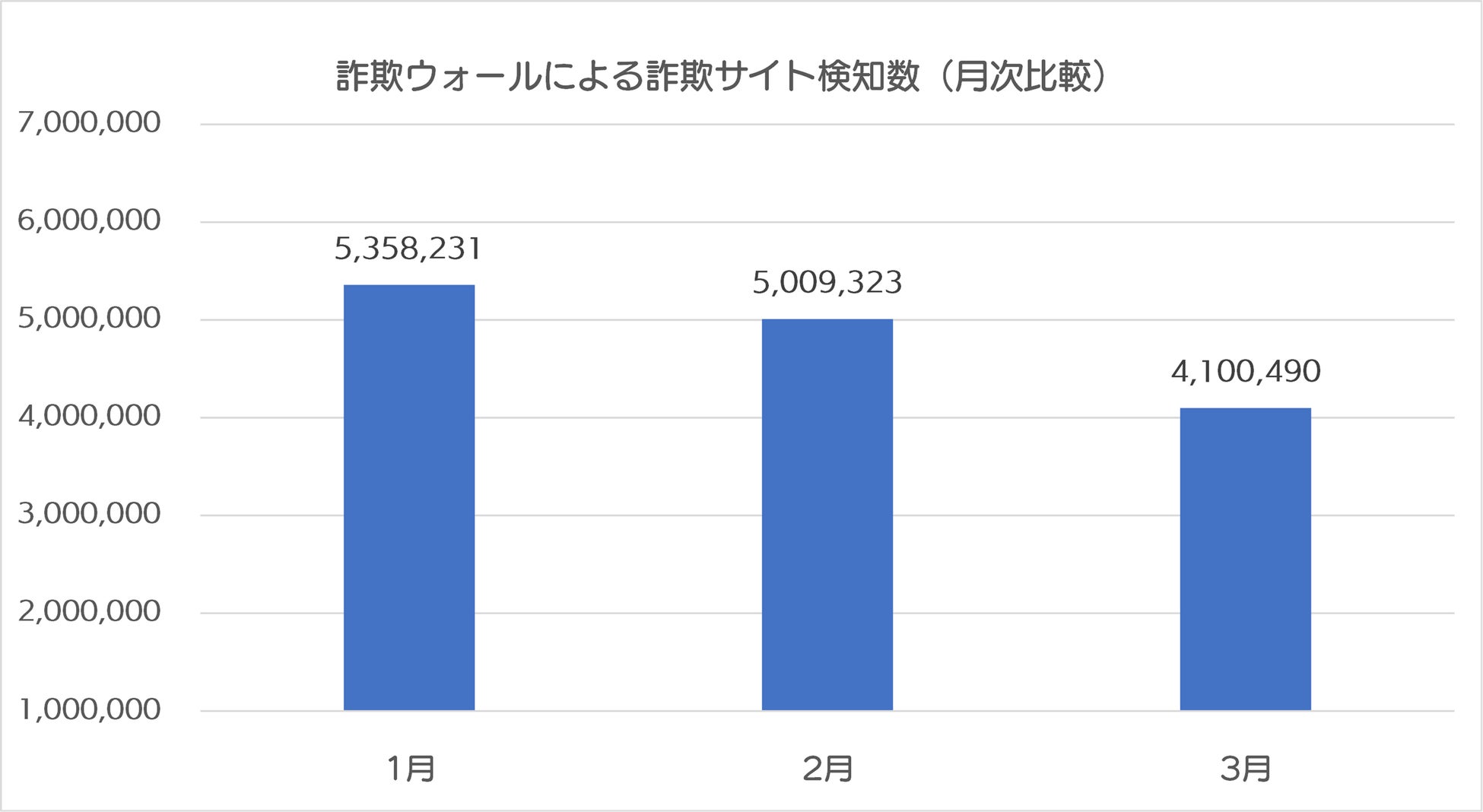 2024年3月の詐欺ウォールによる詐欺サイト検知数は4,100,490件で、2024年2月と比較すると、908,833件減少する結果となりました※。