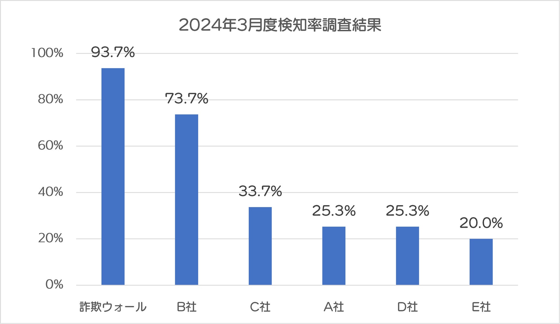 詐欺ウォールを開発・提供するBBソフトサービスでは、公的機関などとの連携によって収集した詐欺サイトURLを利用し、定期的に詐欺サイトの検知率調査を行っています。2024年3月の詐欺ウォールによる詐欺サイト検知率は93.7%と他社と比較し高い結果となりました。