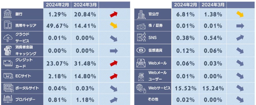 3月度は銀行とECサイトカテゴリの構成比が上昇しています。銀行は三菱UFJ銀行の報告数が増加したことにより実数ベースで増加しています。またECサイトは、メルカリが実数で増加した影響で構成比も増加しています。携帯キャリアはSoftBankが減少したことにより減少しています。
