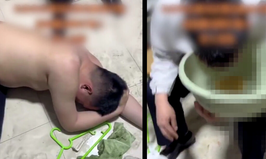 動画のなかには、怪我を負ったと思われる上半身裸の男性がいかにも苦しそうにして床に倒れており、別の男性は洗面器に向かって激しく嘔吐している。