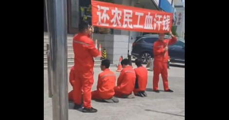 ガス企業の前で土下座し、掲げた横断幕には「農民の出稼ぎ労働者が、働いた血と汗の給料を払ってください(還農民工血汗銭)」と書かれている。