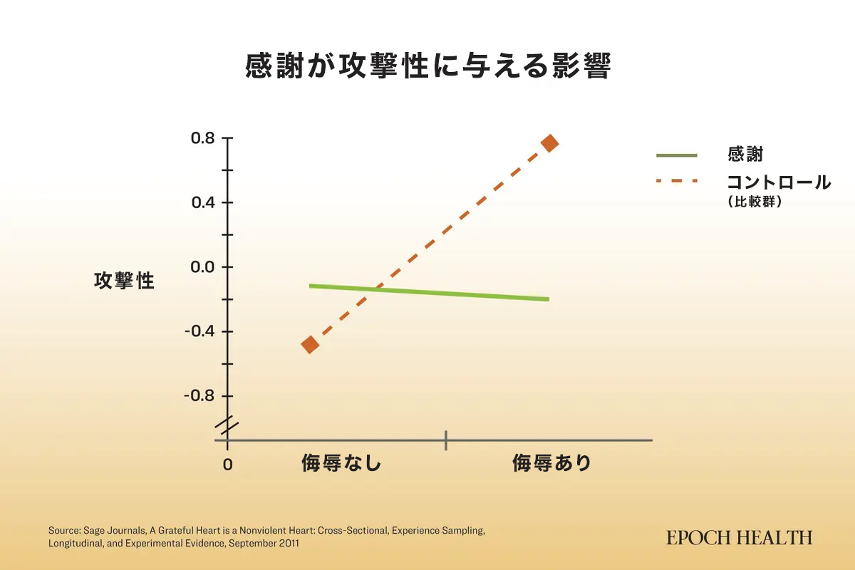 2012年に「Social Psychological and Personality Science」に掲載された研究では、感謝を実践した人々は、侮辱を受けても攻撃性が低下することが確認されました。一方、感謝を実践しなかった対照群では、侮辱を受けた後に攻撃性が増加したという結果が得られています。