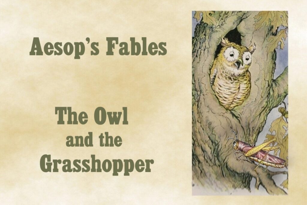 ある暖かな夏の午後、フクロウが古いオークの木の穴の中でうとうとして寝ていると、近くで、キリギリスが楽しいけれど、少し騒がしい歌を歌い始めました。すると、この年を取ったフクロウは、木の中から頭をぽっかりと出しました。