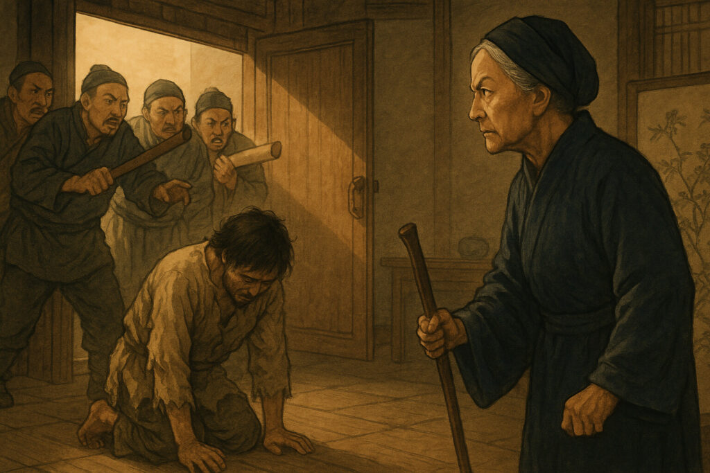 彼はひざまずき、自らの境遇を涙ながらに訴え、助けを求めました。老婦人は彼を哀れに思いましたが、その時、債権者たちが玄関の外にまで迫って来ました。老婦人はドアを開け、「私はこの家に住んでいる未亡人だ。この家にこれだけの人数の男が入ったことは一度もない。お前たちは一体何の用があってここへ来たのだ!」と彼らを叱責しました。