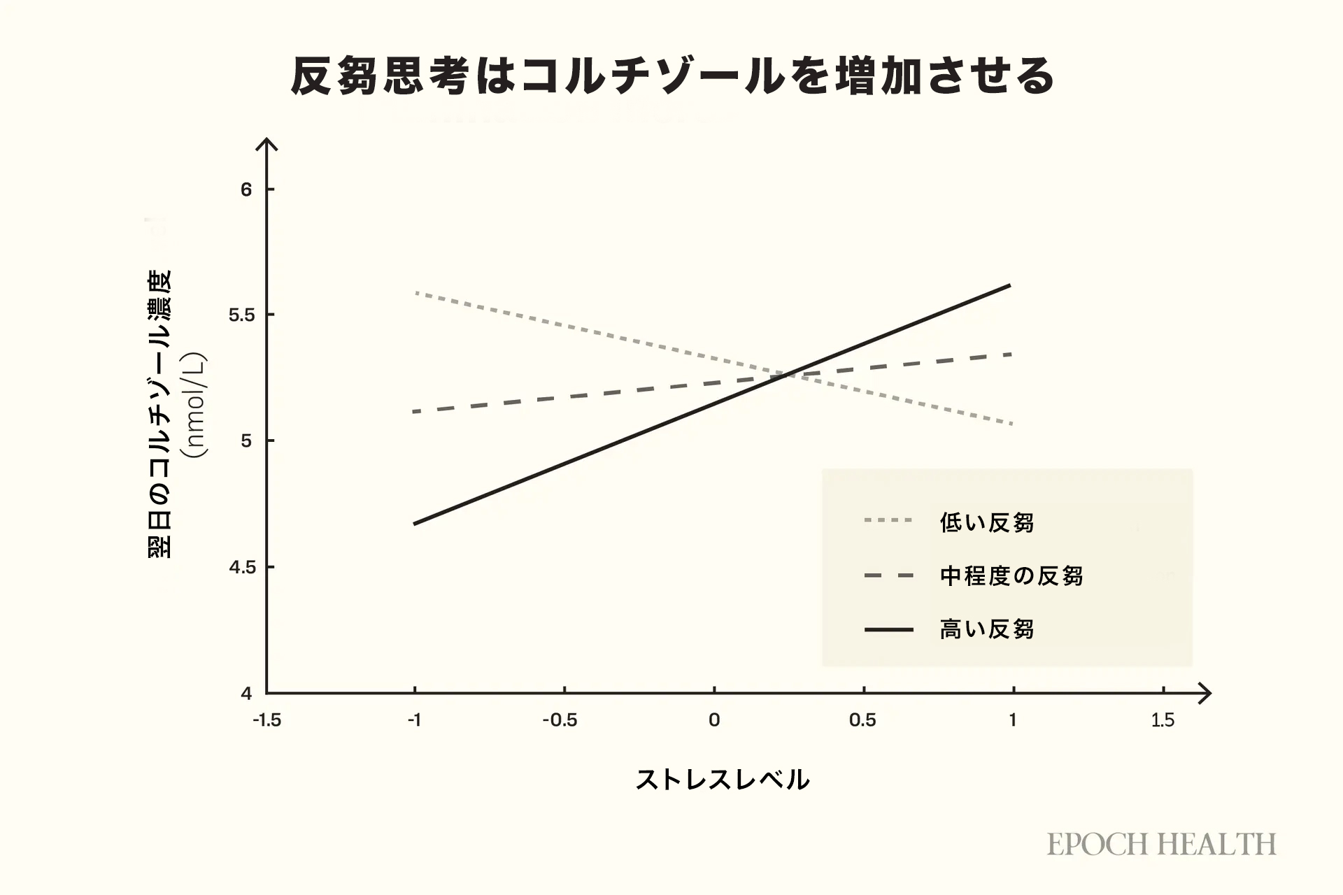 2019年の研究によれば、反芻思考は睡眠時間の減少と、目覚め時のコルチゾール濃度の上昇と関連していることも示されています。