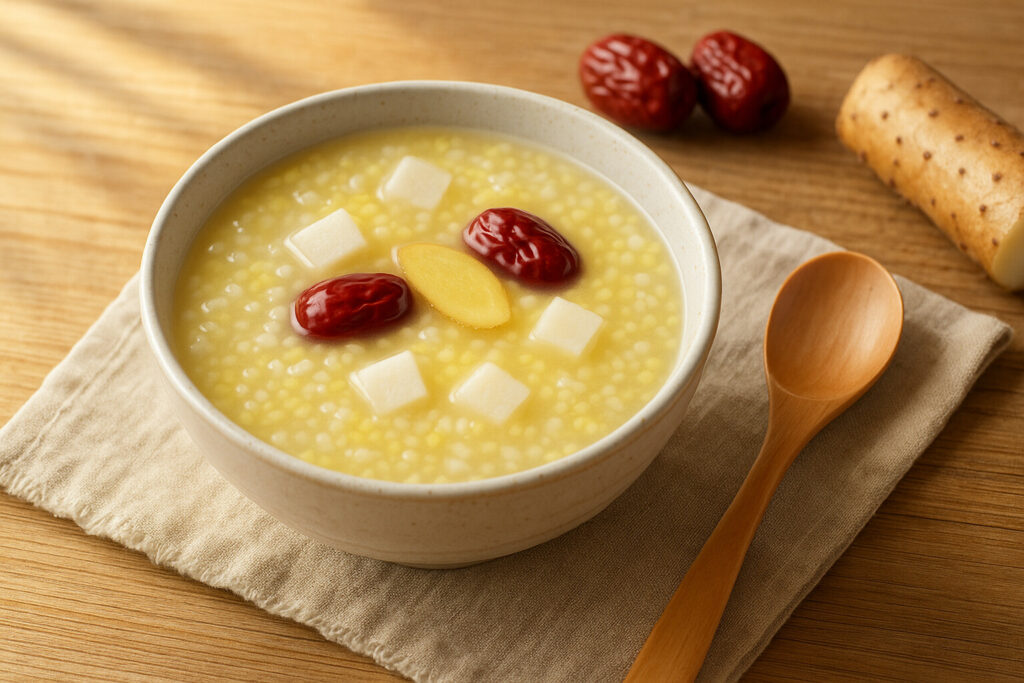 理由:粥は消化がよく、キビは脾を助け、生姜は温めて巡りを促し、ナツメは気血を補います。朝に一杯飲めば、脾経を通じて陽気が立ち上がります。