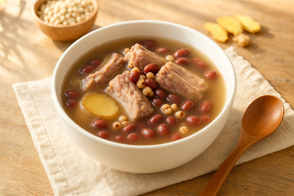 理由:小豆は水の通りを良くし、ハトムギは湿を取り除き、生姜はお腹を温めます。骨付きスープと組み合わせることで陰を養い、陽を補います。夜の回復に最適です。