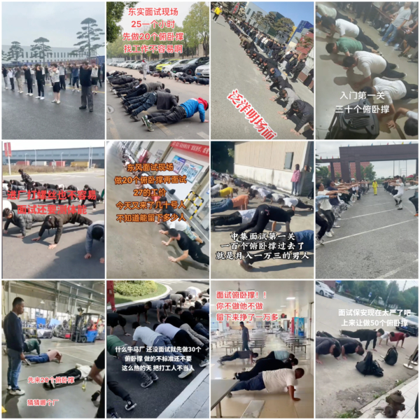 「体力勝負」となった中国企業の面接現場。求職者が腕立て伏せなどの体力テストに挑んでいる様子(SNS動画より)