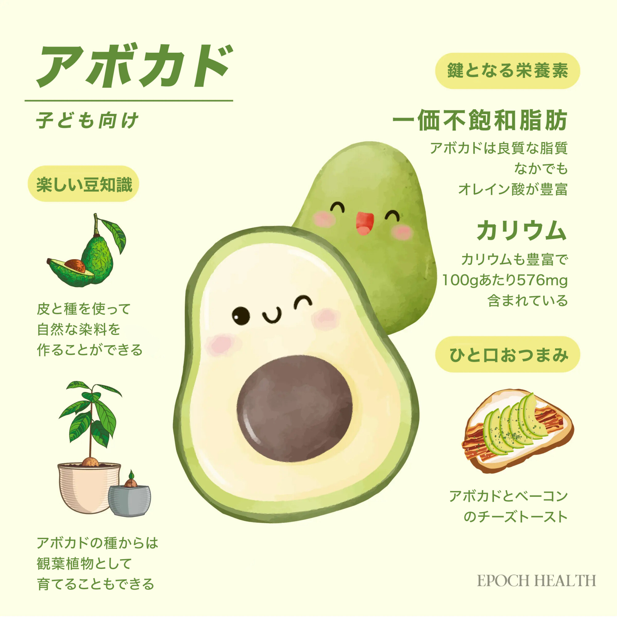 アボカドは成長中の子どもに素晴らしい食品です!その栄養素は強い免疫系をサポートし、骨を強化し、健康な脳の発達を助けます。