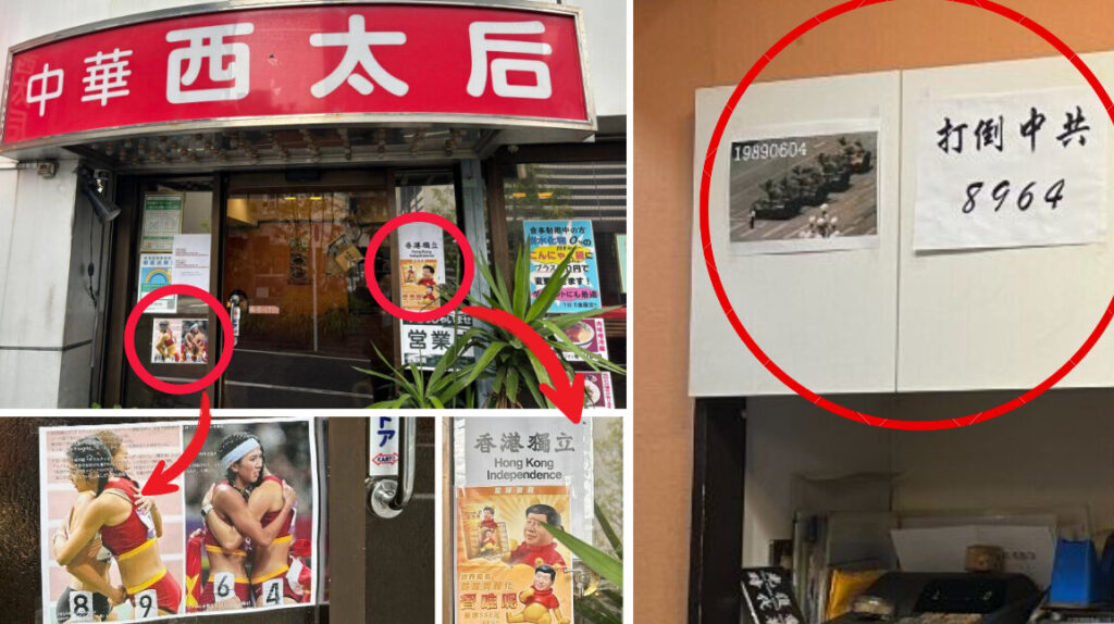 反共ポスターを貼って中国人迷惑インフルエンサーを撃退した、東中野駅(西口)にある中華料理店「西太后」。 (SNSより、大紀元合成)