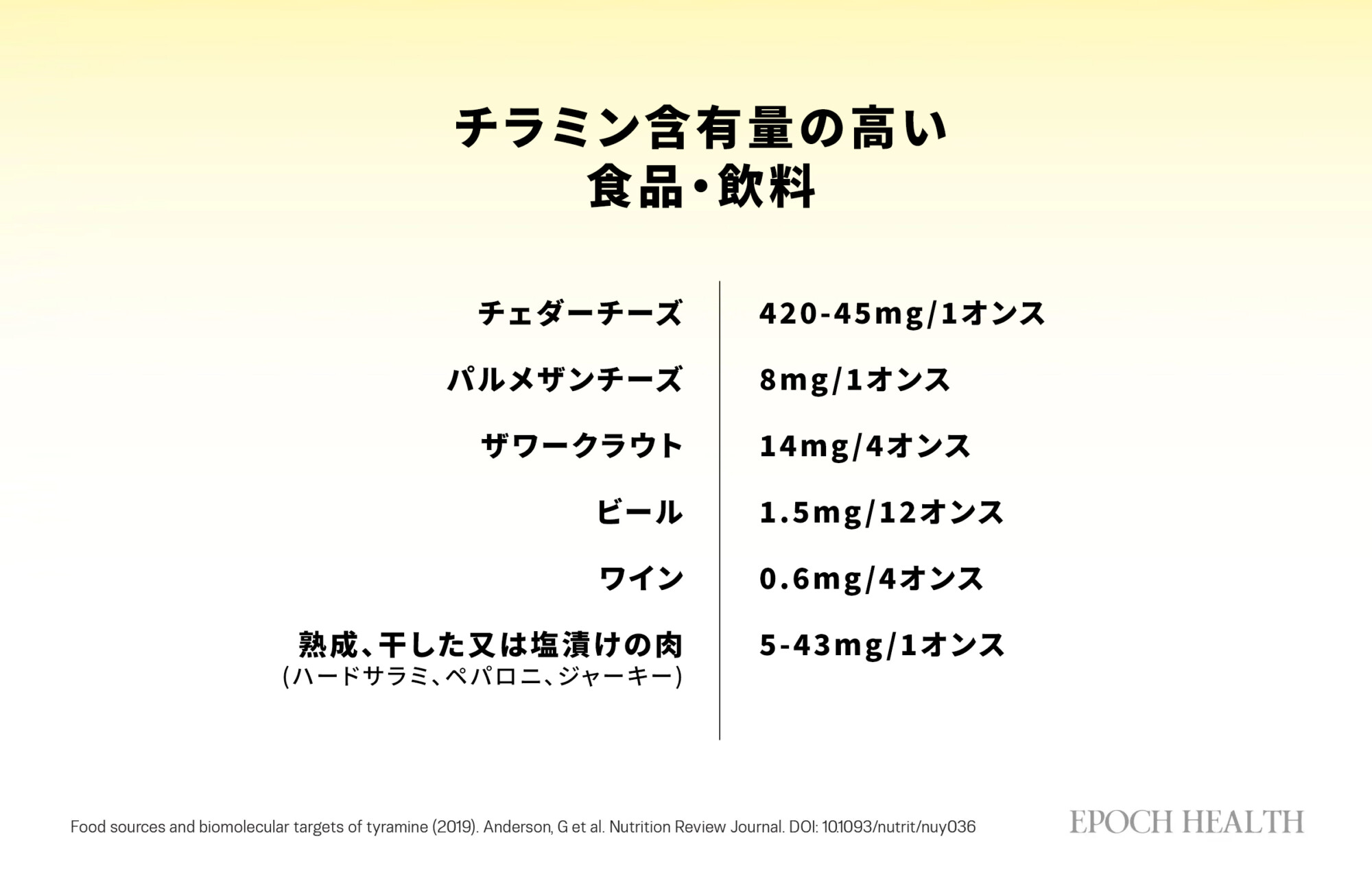 - 過熟した食品、24~48時間以上経った残り物、「賞味期限」を過ぎた食品は避ける。食品が古くなるとチラミン含有量は増加する。