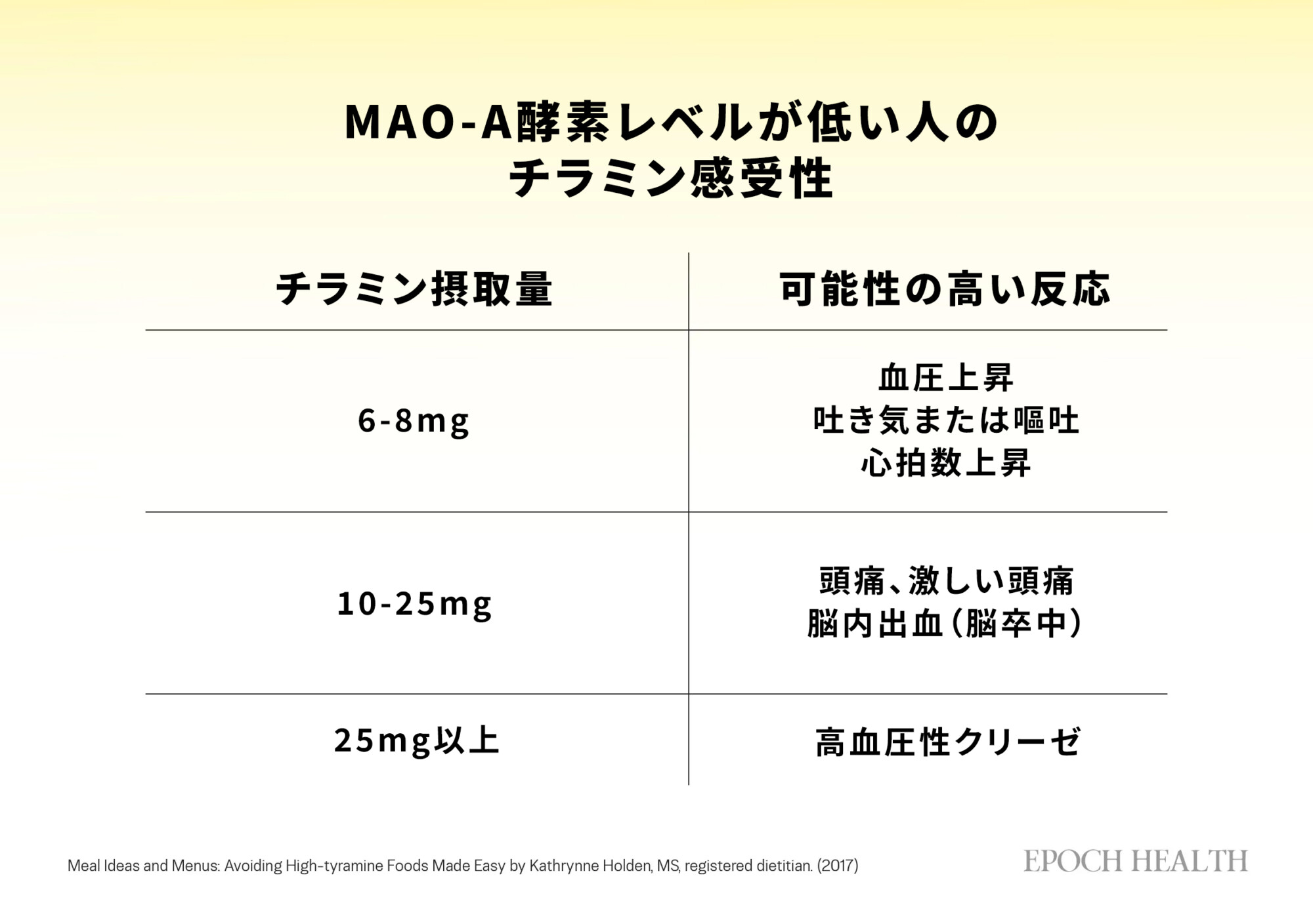 また、慢性的なストレスはノルアドレナリンの増加を招き、低下しているMAO-Aの働きをさらに圧迫します。その結果、高血圧や気分の変動などの症状が悪化します。症状は高チラミン食品を食べた数時間後に現れることが多く、診断を難しくしています。