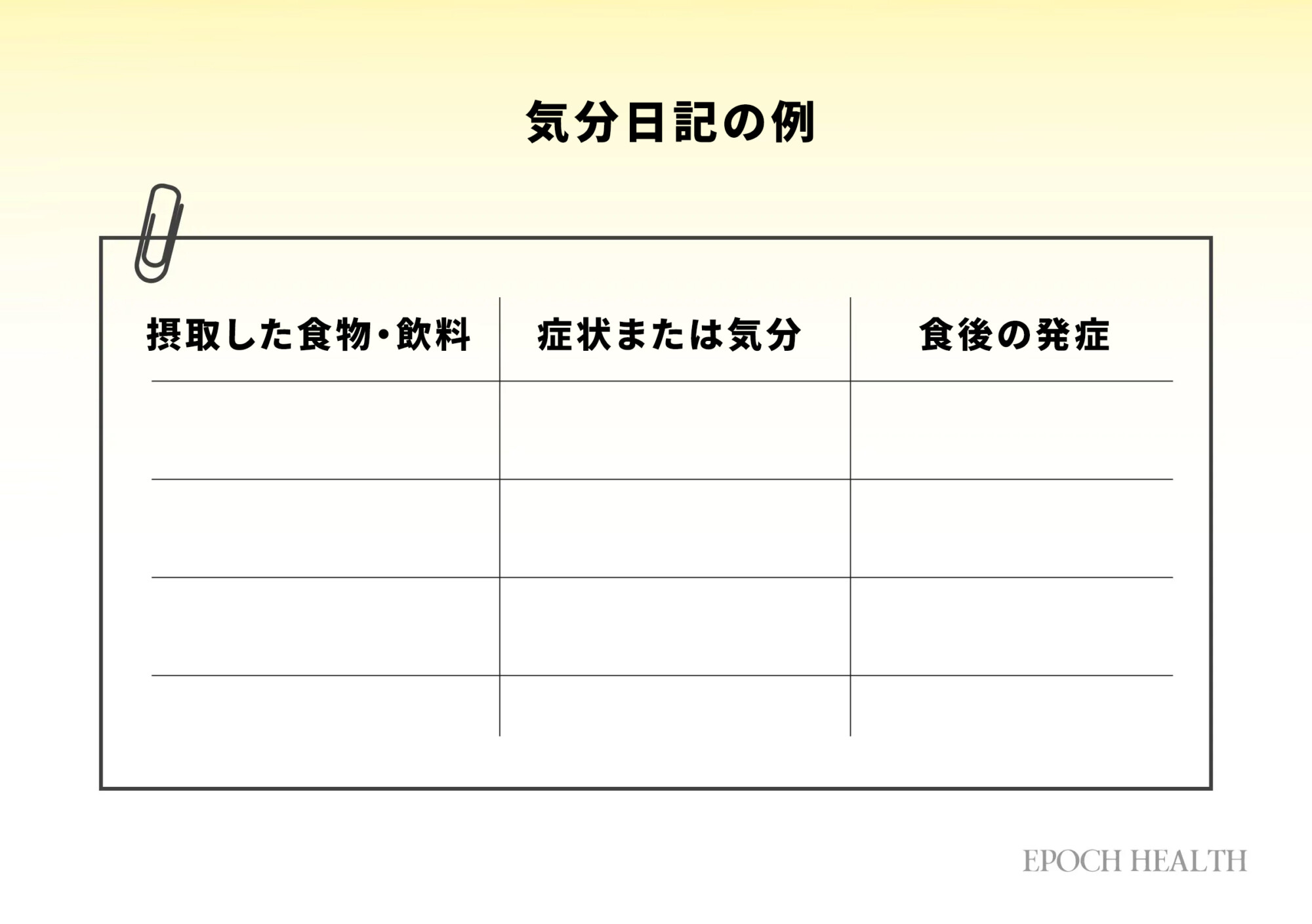 - 気分や症状(頭痛、吐き気、発汗、動悸、不安など)を記録する。食品への反応は数時間遅れて現れることが多いため注意する。