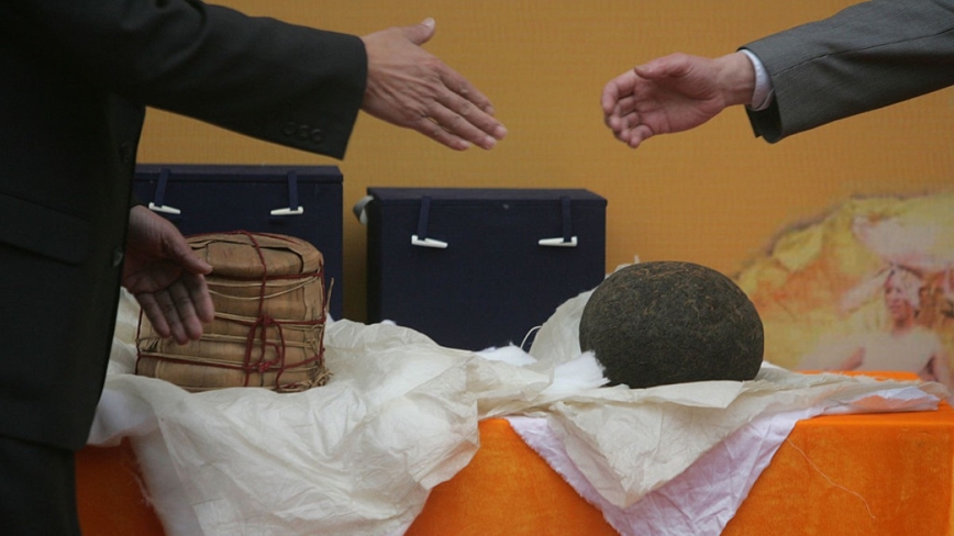 イメージ画像。2007年3月19日、北京で行われた儀式で、雲南省普洱市(ふじ-し/ プーアル茶の産地)の代表と故宮博物院の管理官が百年物のプーアル茶(重さ約2.5キロ、当時の評価額200万元=約3,000万円)の受け渡しに臨んだ。(China Photos/Getty Images)