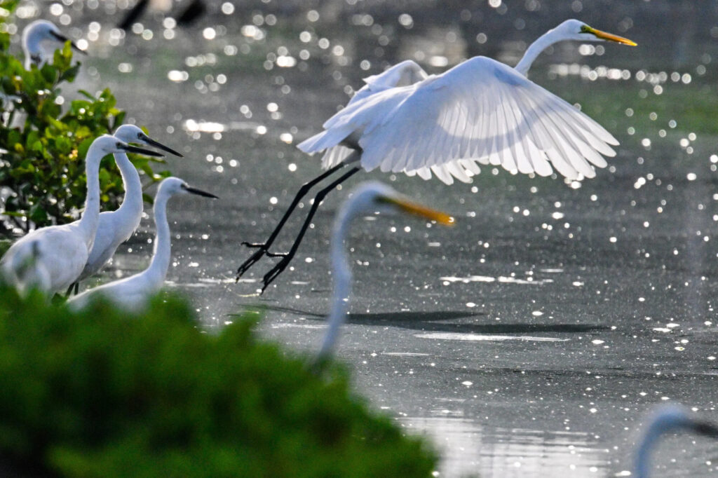 インドネシア・バンダアチェで2025年9月13日、白鷺が水辺から飛び立った。