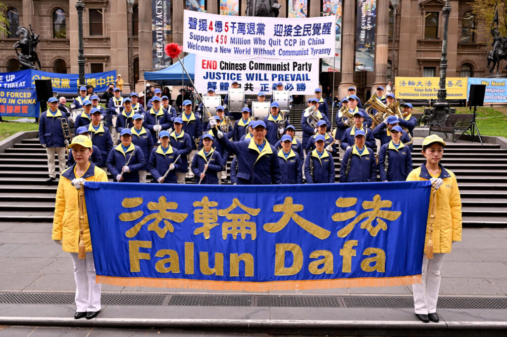 2025年9月13日、オーストラリア・メルボルンのビクトリア州立図書館の階段で、法輪大法のバンドが抗議活動の一環として演奏した。