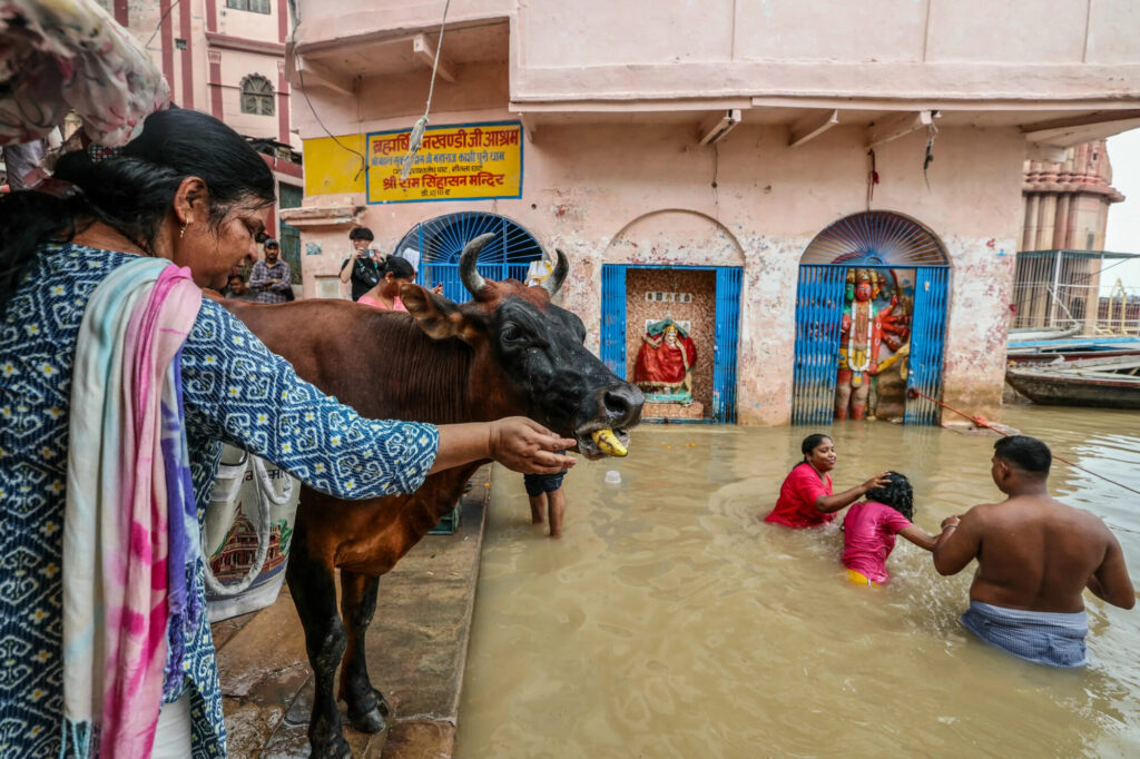 2025年9月13日、インド北部ウッタル・プラデーシュ州バラナシで豪雨モンスーンによりガンジス川の水位が上昇し、ダシャーシュワメード・ガート周辺の寺院が一部冠水した。冠水した川岸では多くのヒンドゥー教徒が沐浴を行い、その傍らで女性が牛に餌を与える光景も見られた。