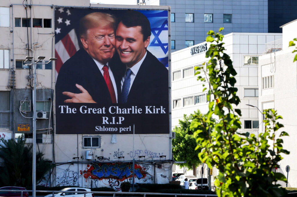 2025年9月10日、ユタ州オーレムのユタ・バレー大学で大勢の観衆に演説中、保守派の有力インフルエンサーであるチャーリー・カーク氏が銃弾1発を受け死亡した。そのカーク氏を抱きしめるドナルド・トランプ米大統領の姿が描かれたビルボードが、2025年9月13日にテルアビブ市内の建物の側面に掲げられている。