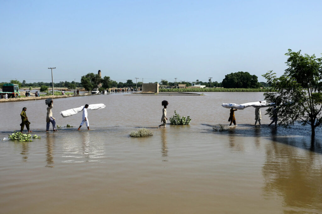 2025年9月13日、パキスタン・パンジャブ州ムザッファルガル地区アリプールでは、洪水被害を受けた人々が、浸水した地域を歩き、仮設テントを運ぶ様子が見られた。