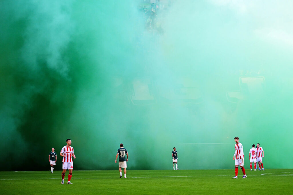 2025年9月13日、ドイツ・ヴォルフスブルクのフォルクスワーゲン・アレーナで行われたブンデスリーガ、VfLヴォルフスブルク対1.FCケルン戦で、観客が緑色の発煙筒を焚いた。