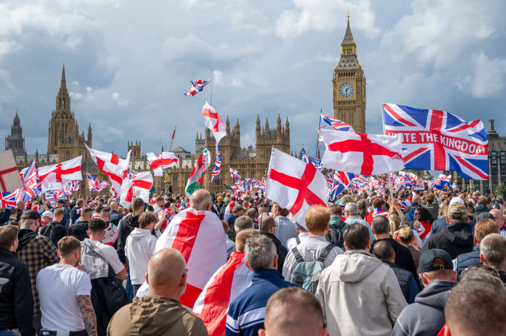 2025年9月13日、イギリスのロンドン中心部で開かれた「英国を団結させよ」集会において、一般市民がイギリス政治の中心地であるホワイトホールへ向かうためにウェストミンスター橋を渡った。