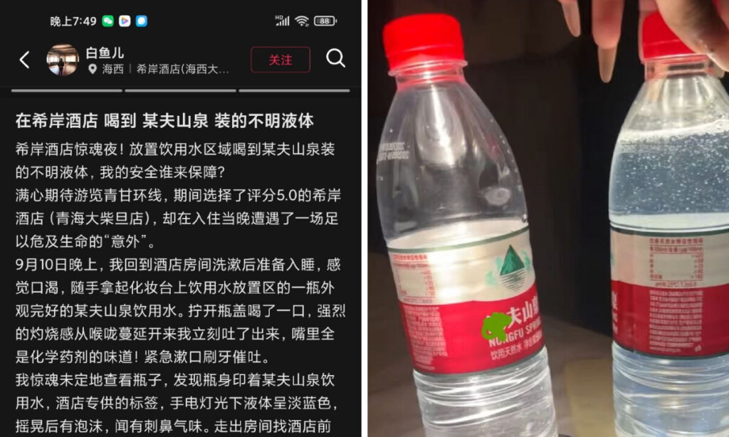 中国・青海のホテルで、客室に置かれたペットボトル水の中身が化学薬品だったことが発覚した。飲んだ女性は喉に激しい痛みを訴え、病院で「喉や食道に火傷のような損傷」と診断された。安心して飲めるはずの水が命取りになりかねない出来事に、不信が一気に広がっている。