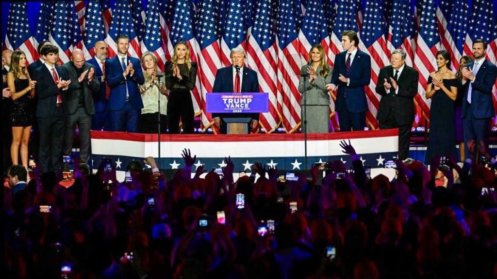 当時共和党の大統領候補だったトランプ氏は、2024年11月6日、フロリダ州ウェストパームビーチのウェストパームビーチ・コンベンションセンターで行われた選挙当日のイベントで演説した(Jim Watson/AFP via Getty Images)
