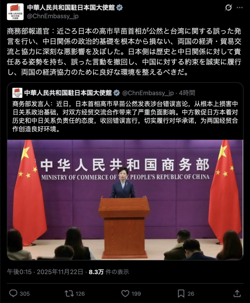 22日の投稿では、中国商務部報道官が日本の高市早苗衆院議員を名指しし、台湾に関する「誤った発言」を行ったと批判した。