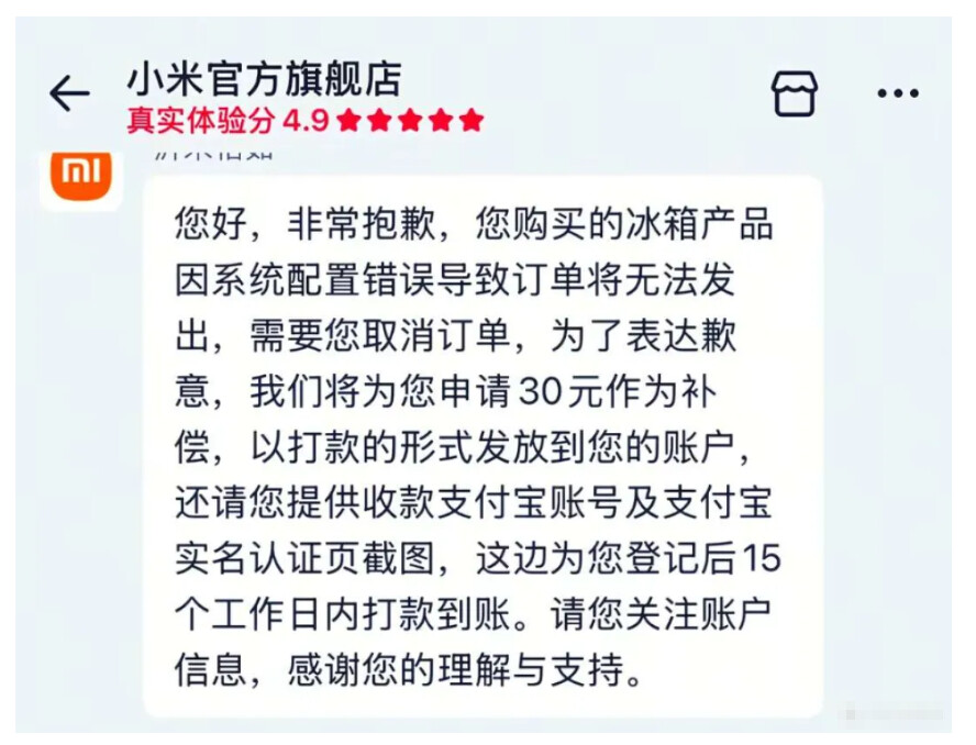 シャオミ側の担当者が購入者に送った通知文。システム設定のミスを理由に発送できないと伝え、注文の取り消しとともに30元(約600円)の補償を提示している(スクリーンショット)