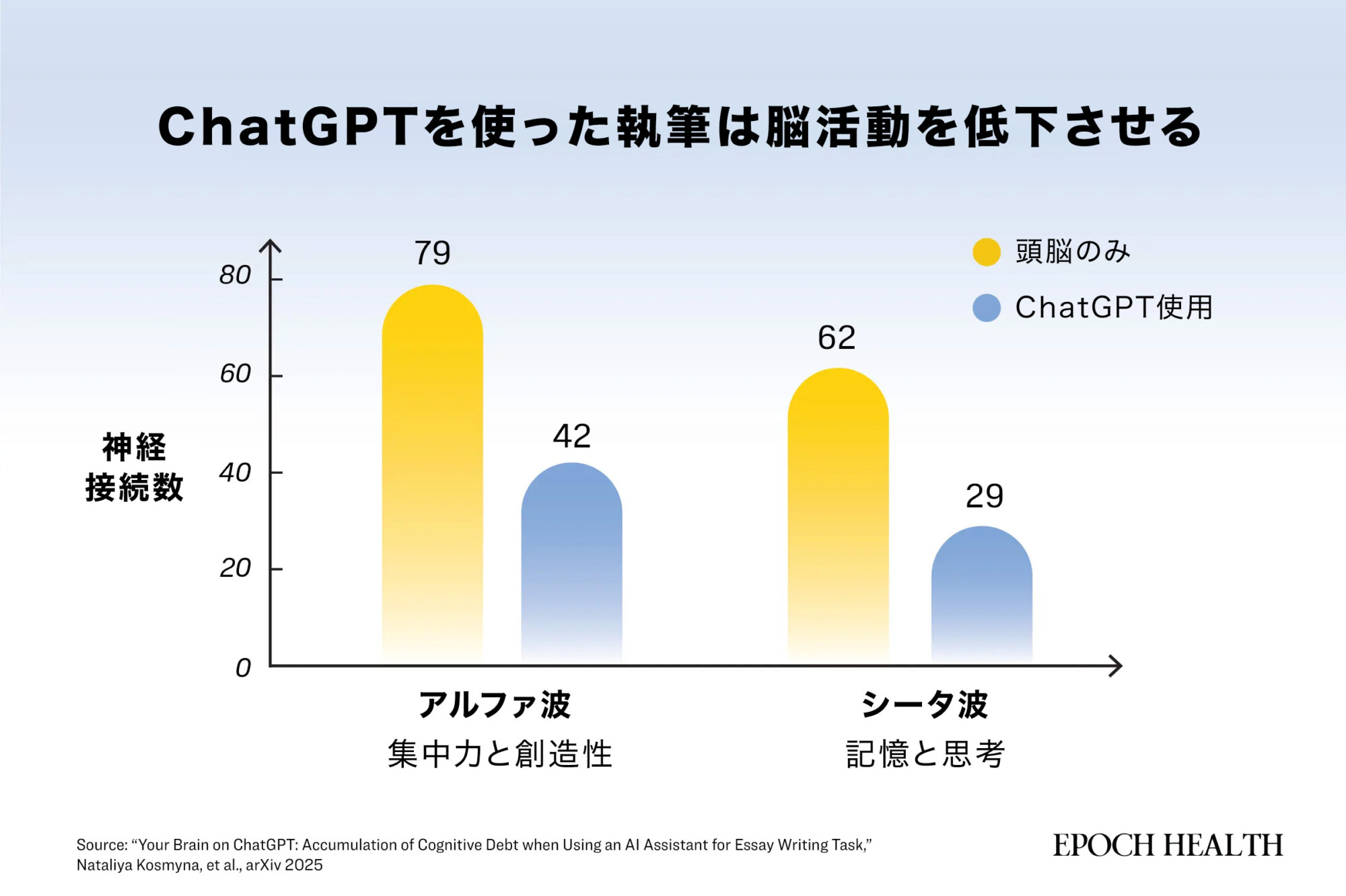 記憶形成と深い思考に関連するシータ周波数帯では、その差はさらに大きく、頭脳だけで書いた人は62の接続、AI使用者は29の接続でした。