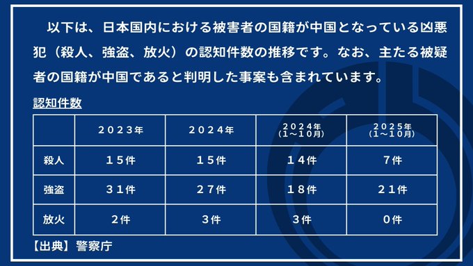 また、日本外務省は日本国内における被害者の国籍が中国となっている凶悪犯(殺人、強盗、放火)の認知件数の推移を公表し、「最近の中国政府による発表において、あたかも今年に入って日本国内における中国国籍者に対する犯罪事件が多発しており、安全に対するリスクが高まっているかのような言及があるが、そのような指摘は当たらない」として中国当局の主張を否定した。