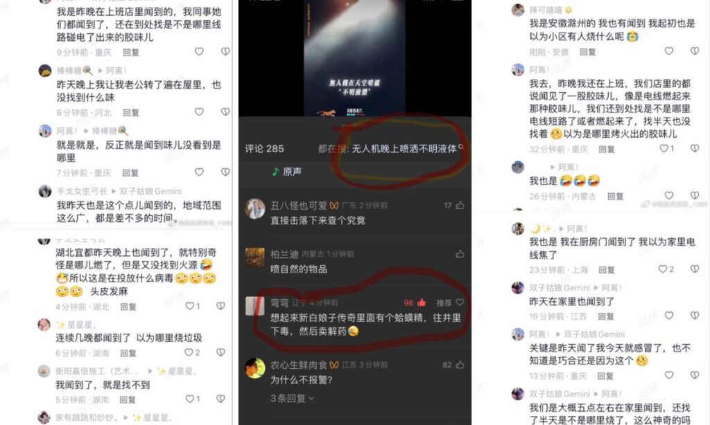 北京市、重慶市、上海、遼寧省、河北省、河南、湖北、湖南、安徽、浙江、江蘇、広東、貴州省、広西チワン族自治州、内モンゴル自治州など十数の省市で、同じような「深夜の散布」「焦げた臭い」が相次いで報告された。SNSに投稿された映像には、ドローンが真夜中の市街地や郊外で白い霧をまき、上空から地表近くまで不規則に飛ぶ姿が映っており、異様さが強い注目を集めた。