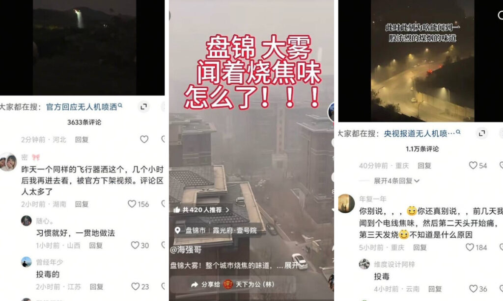 遼寧省盤錦(ばんきん)市では、濃い霧の中で焦げた臭いを感じたという投稿に8千件以上のコメントが寄せられ、別の住民が「強烈な煤煙の臭いがした」と投稿した動画には1.1万件を超える反応が集まった。いずれも「どこからの臭いか探したが分からない」という証言であり、同様の報告は各地で繰り返されている。