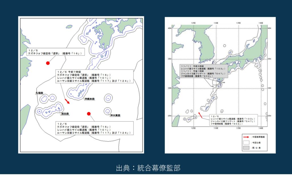 2025年12月5日、中国共産党(中共)海軍の艦艇群が沖縄周辺海域で相次いで航行する動きが確認された。統合幕僚監部は12月6日、これら二つの事案について発表した。