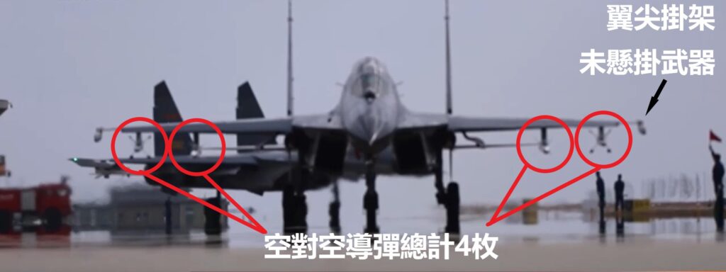 CCTV映像には第2隊の戦闘機の離陸前のシーンも含まれており、アップで撮影されている。その場面では片翼下に2発の防空ミサイル、さらに翼端には3つ目の兵器のような物体が映っており、無人機が搭載するような軽量の対地ミサイルに見えた。CCTV映像によれば、第2隊のJ-16は計6発の兵装を装備していたことになるが、日本防衛省が公表した写真とはさらに大きな齟齬がある。