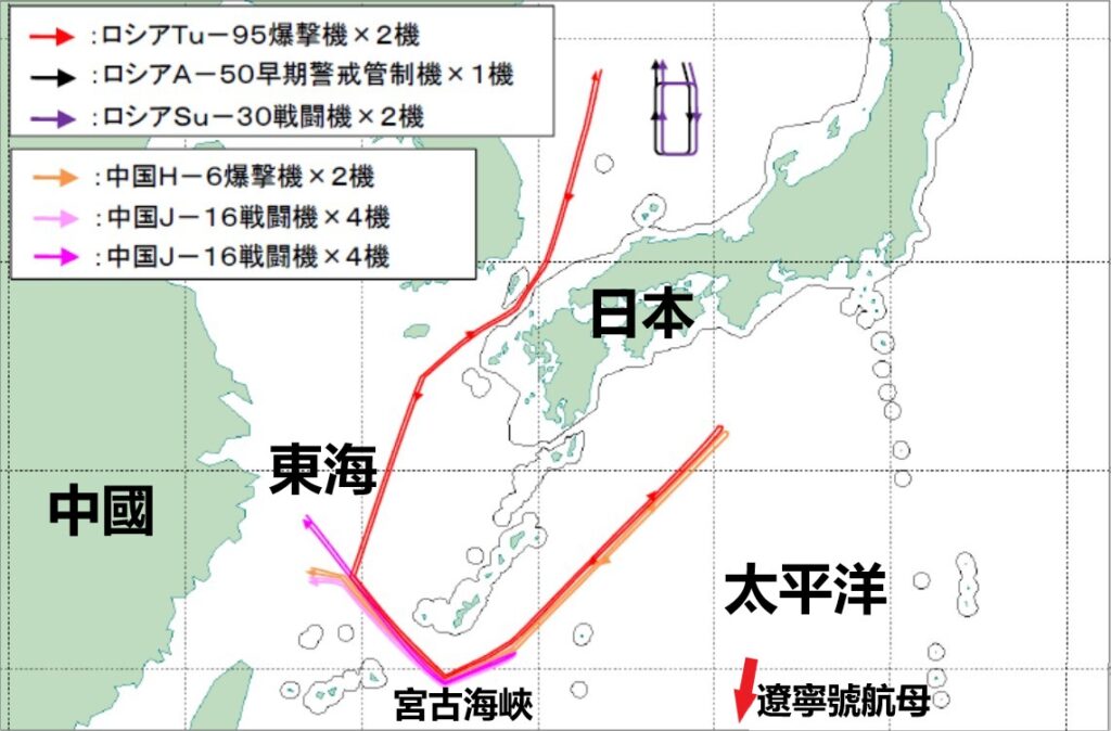 第1隊の4機は宮古海峡を越えたところで燃料の限界に達し、やむなく帰還。H-6爆撃機とロシアの爆撃機は単独で日本本土方面へ飛行し、戻りの際に第2隊のJ-16が宮古海峡近辺で護衛する形を取った。第一列島線の外は爆撃機にとって最も脆弱な空域であるにもかかわらず、同空域での護衛は行われなかった。