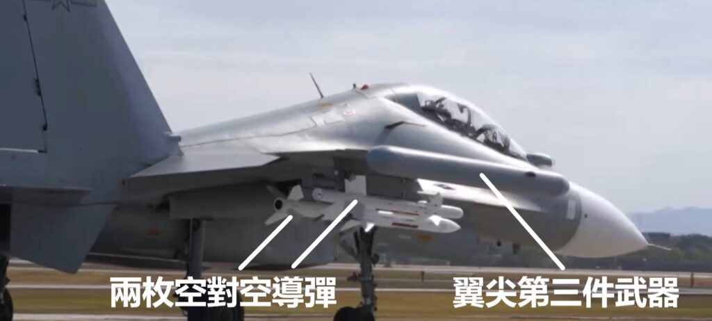 映像冒頭では、2機の戦闘機が滑走路に向かって進む様子が映し出されており、両翼下にそれぞれ2発ずつ、計4発の空対空ミサイルを搭載していた。これは中国空軍戦闘機が実弾を装備して空戦に備える際の標準的な搭載形態とみられる。今回、中共側は各4機ずつ2隊のJ-16戦闘機をH-6爆撃機の護衛として出動させたため、4発の空対空ミサイルを装備している様子は一見して妥当なものに見えた。