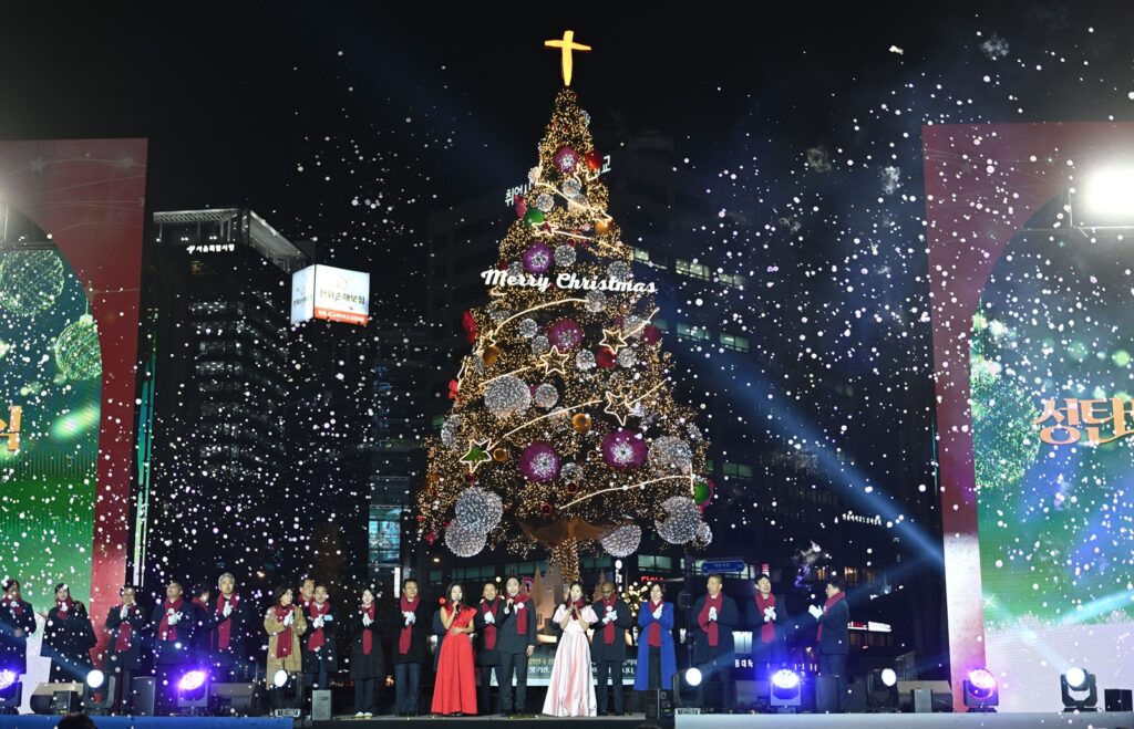 2025年11月17日夜、韓国のソウル市庁前広場で行われた、クリスマスツリーの点灯式。(Jung Yeon-je/AFP via Getty Images)