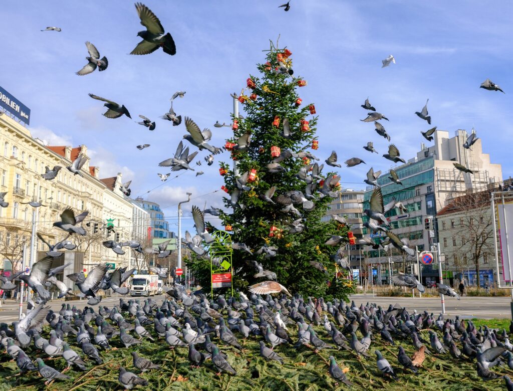 広場に設置されたクリスマスツリーの周りに集まるハトの群れ。2025年11月18日、オーストリア・ウィーン。(Joe Klamar/AFP via Getty Images)
