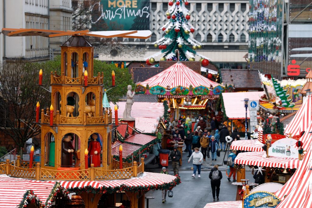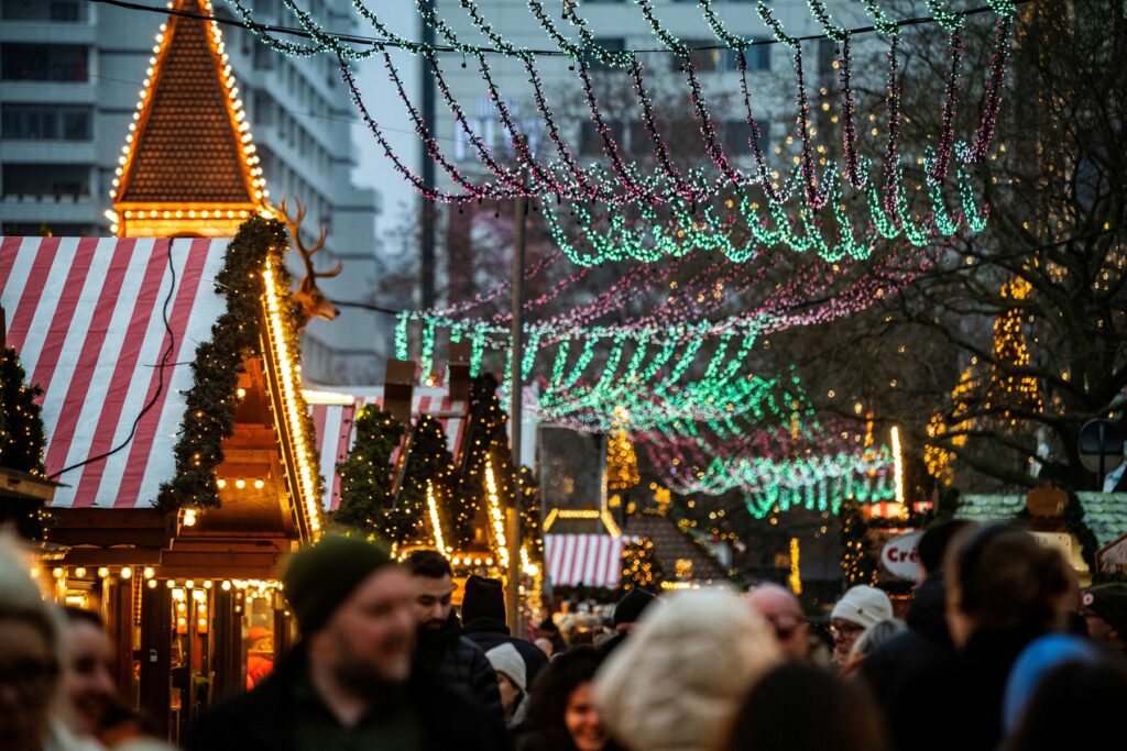 クリスマスマーケットを訪れる人々。2025年12月22日、ドイツ・ベルリンのブライシャイト広場周辺。(John Macdougall/AFP via Getty Images)