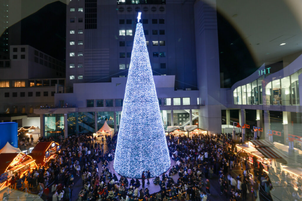 装飾が施された巨大なクリスマスツリーの下に集まる買い物客。2025年12月18日、大阪市の梅田スカイビル。(Buddhika Weerasinghe/Getty Images)
