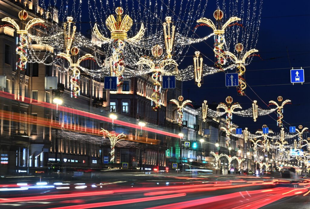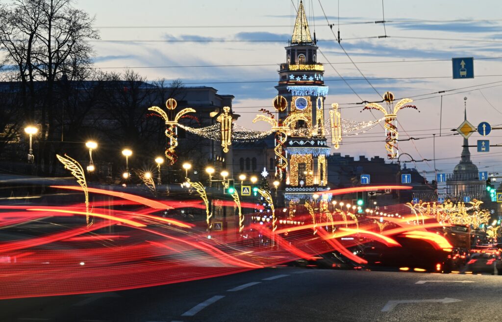2025年12月5日,聖彼得堡最繁華的涅夫斯基大道上布置的聖誕裝飾。(Olga Maltseva/AFP via Getty Images)