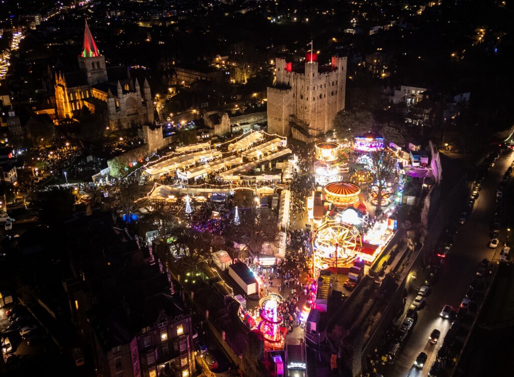ロチェスター城と大聖堂近くで開かれたクリスマスマーケット。2025年12月6日夕方、英イングランド・ケント州ロチェスター。(Chris J Ratcliffe/Getty Images)