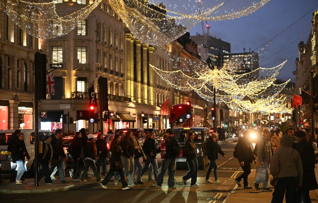 リージェント・ストリートを彩るクリスマスのイルミネーション。2025年12月21日、英ロンドン中心部。(Justin Tallis/AFP via Getty Images)